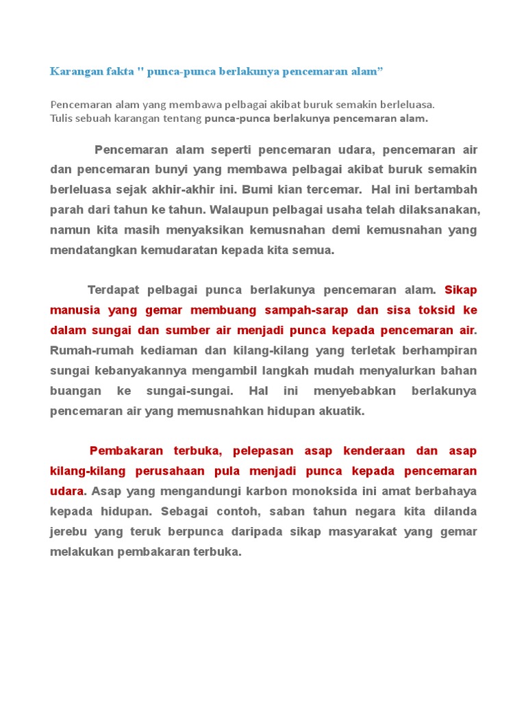 Contoh Karangan Lengkap Punca-punca Pencemaran Udara. 20 markah Berdasarkan gambar di bawah huraikan pendapat anda tentang punca. Related posts to contoh.